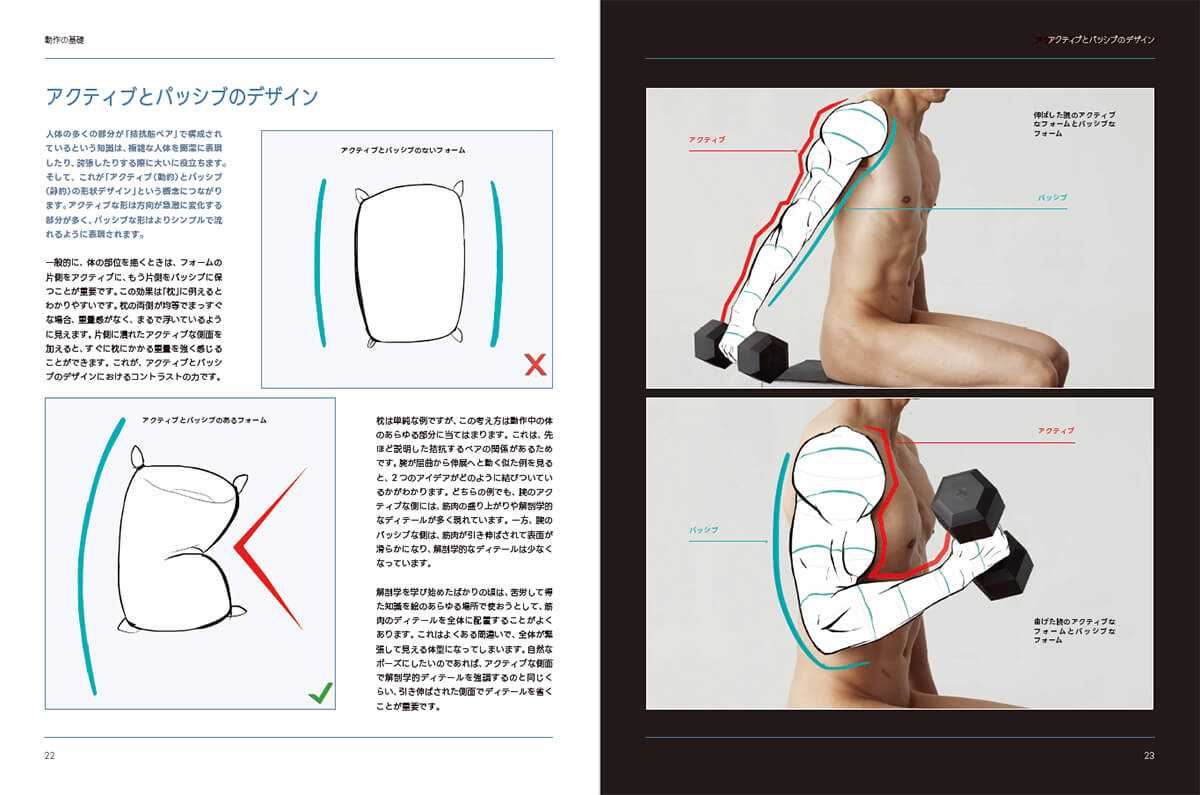 『アナトミー・イン・モーション』は、詳細な写真 と それらに重ね描かれたイラスト(筋肉図、平面図、輪郭図)で構成された「動作する人体」のビジュアルリファレンスガイドです。