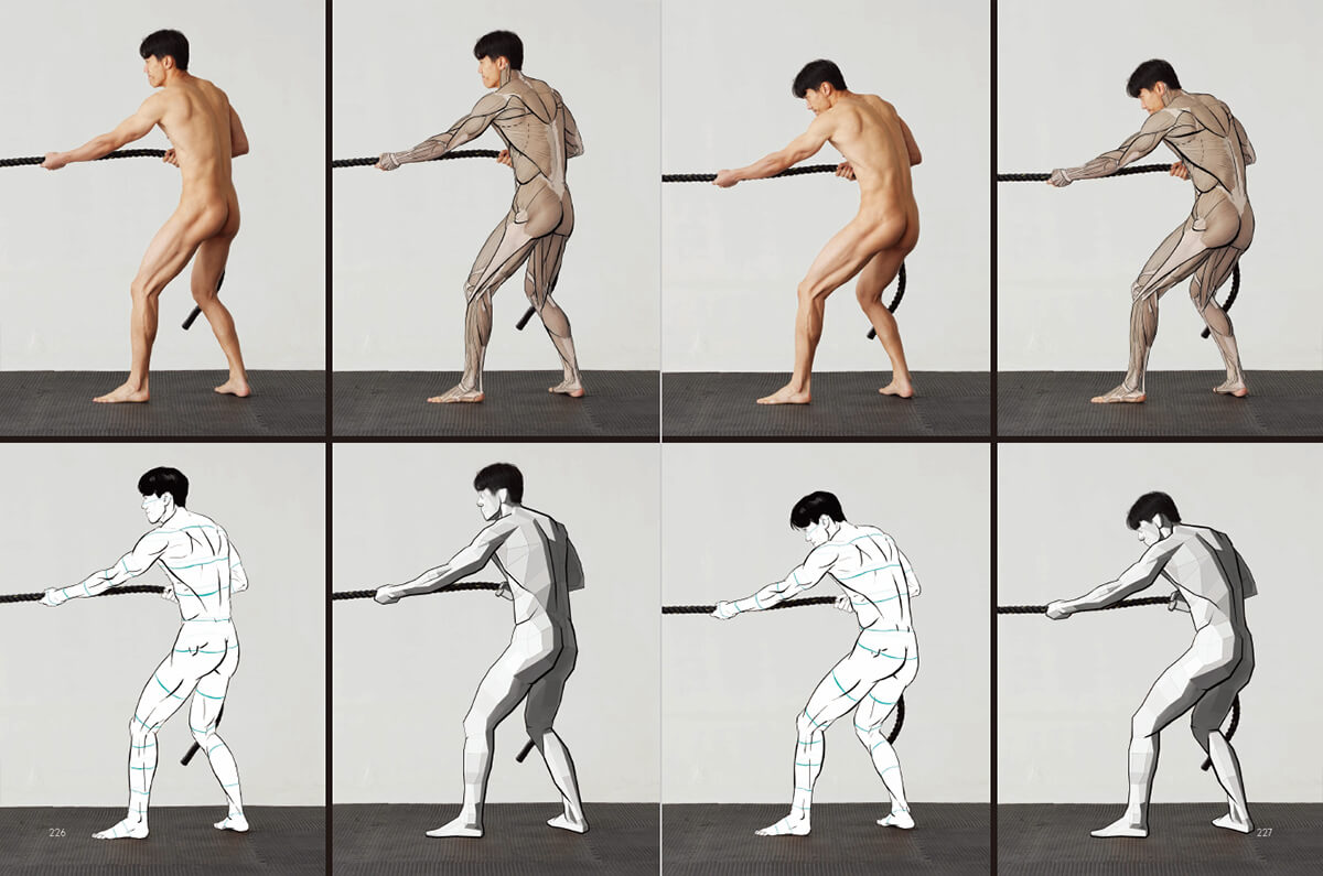 歩行やジャンプ、そして、格闘からダンスまで、幅広いアクションを行うプロのモデルの姿を捉え、さまざまな体型の輪郭、平面、筋骨格を示しています。