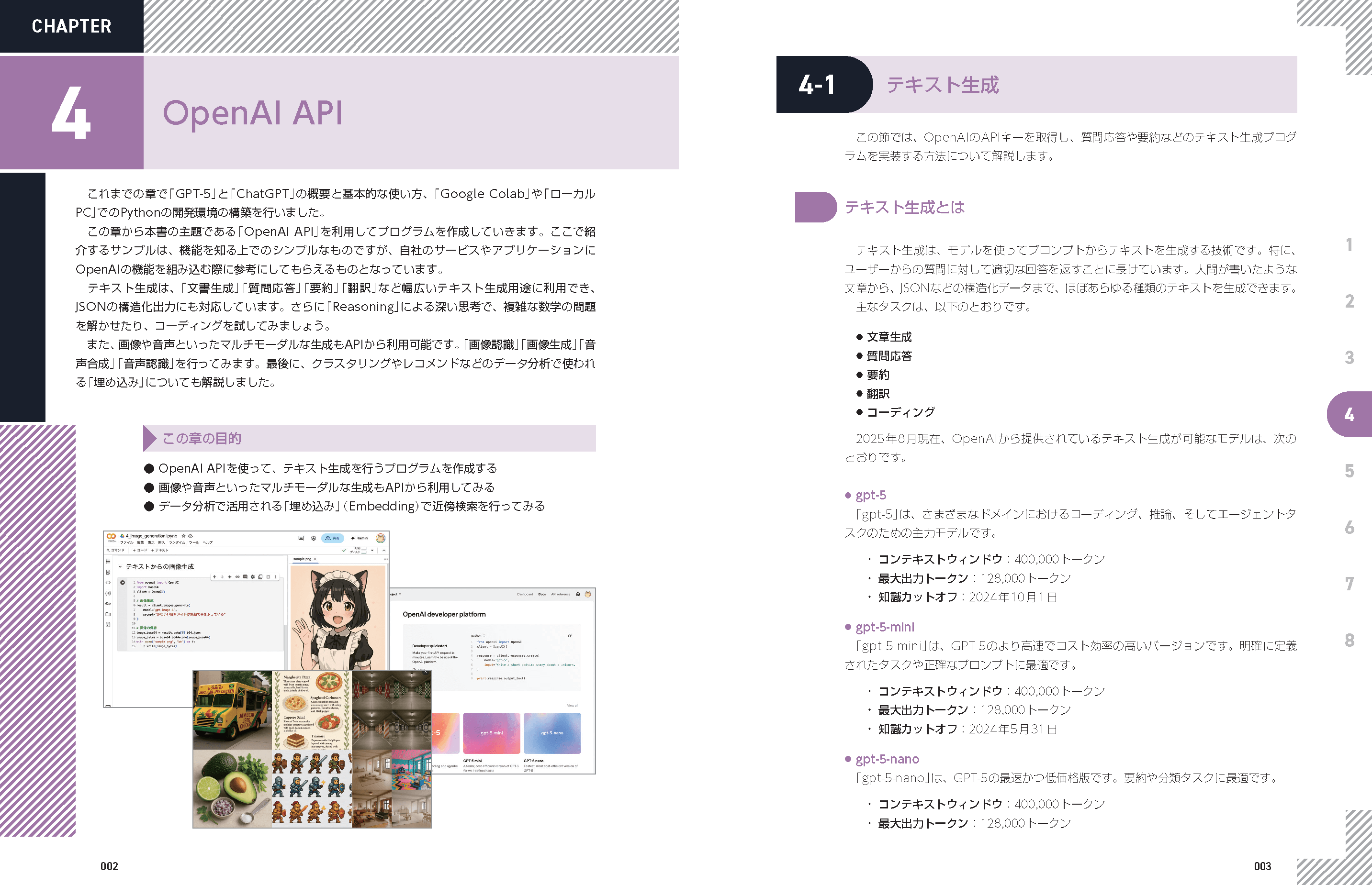 本書は、GPT-5、ChatGPTの利用方法にとどまらず、「OpenAI API」を使うことでカスタマイズしたチャットAIを独自のシステムに組み込むための方法をステップ・バイ・ステップで解説した1冊です。